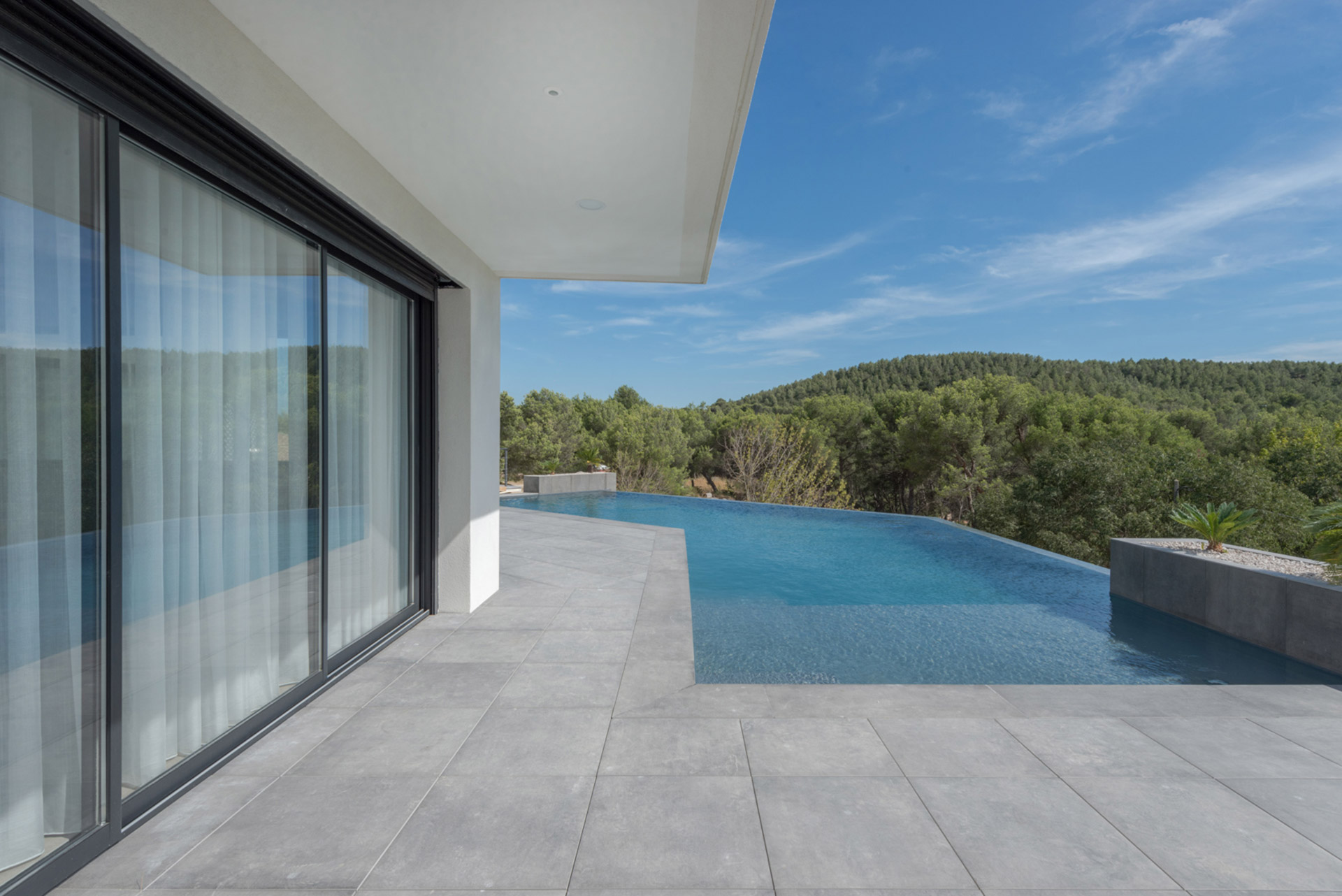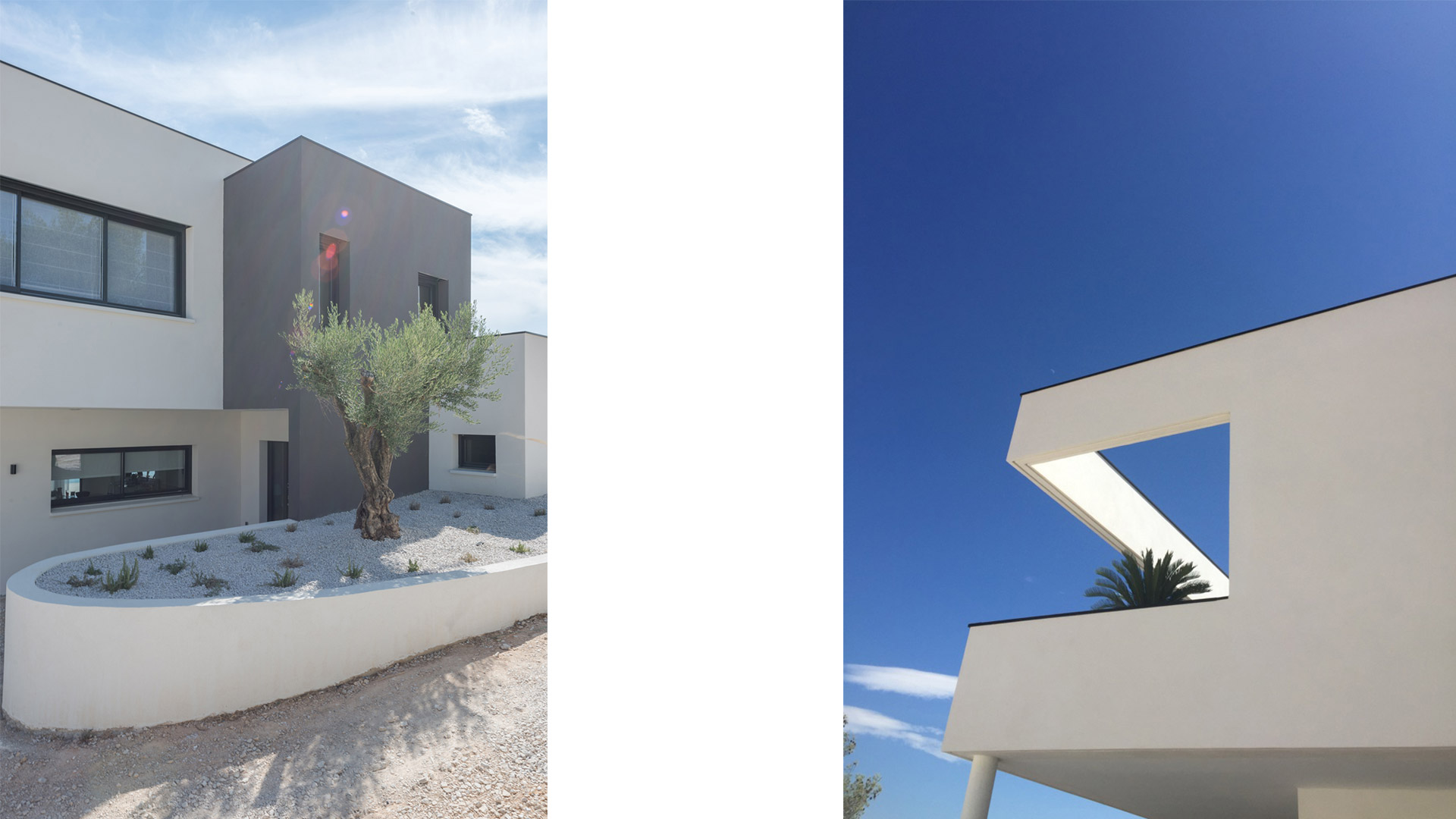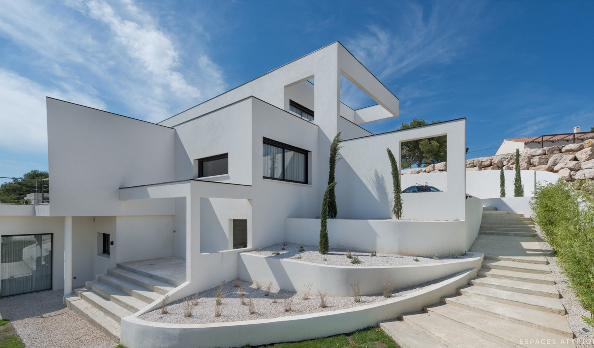 Une cascade de volumes rectangulaires s’empilent en décalage suivant deux axes afin de profiter au maximum des points de vue qu’offre le site sur le village de Ventabren.