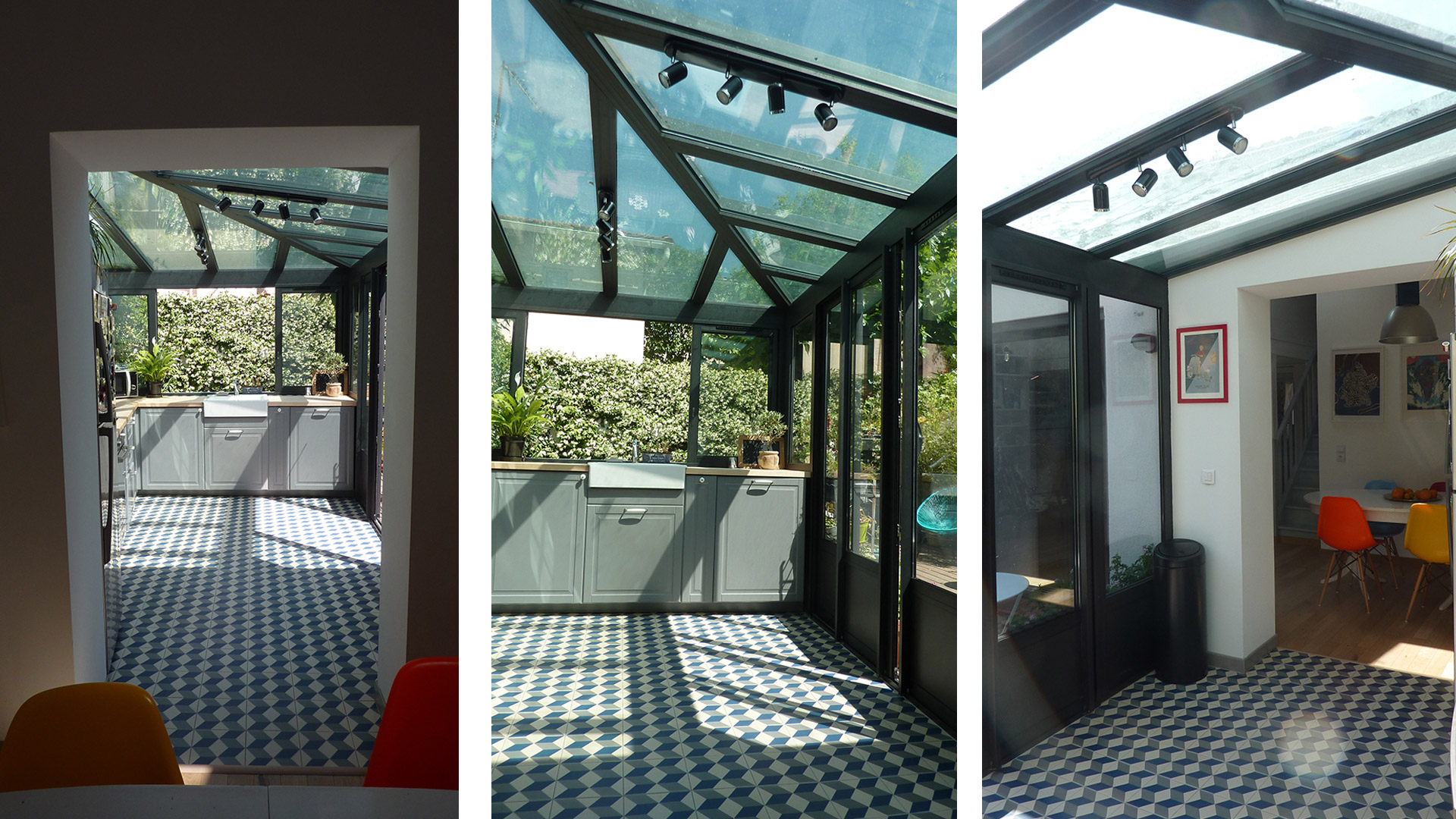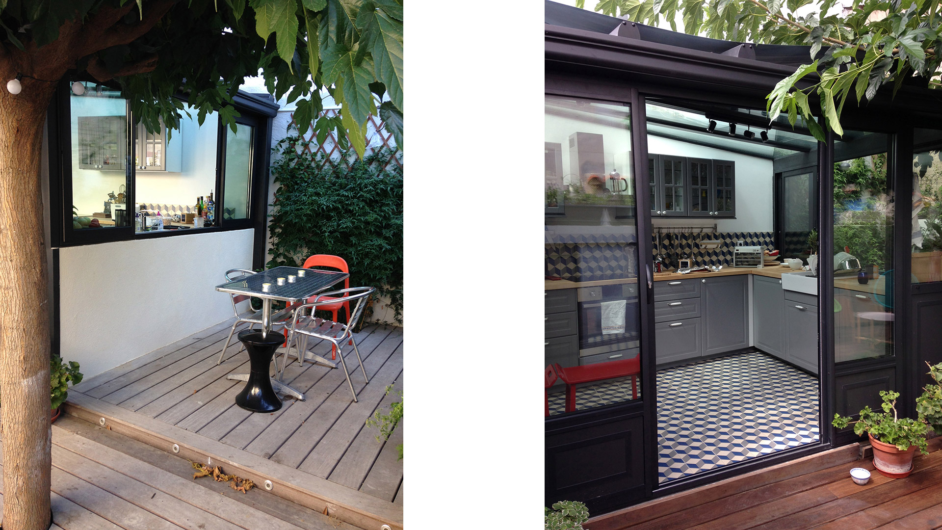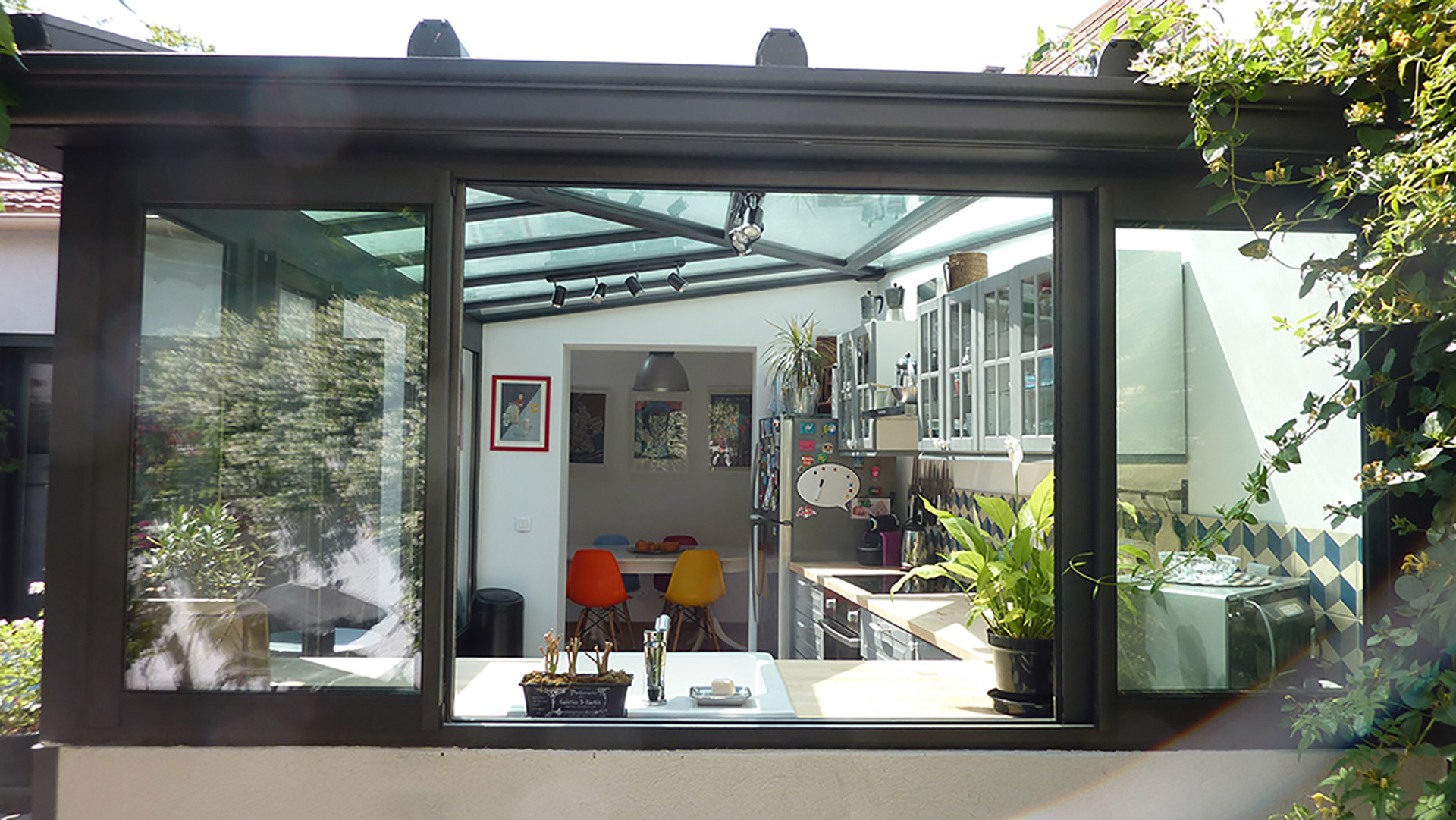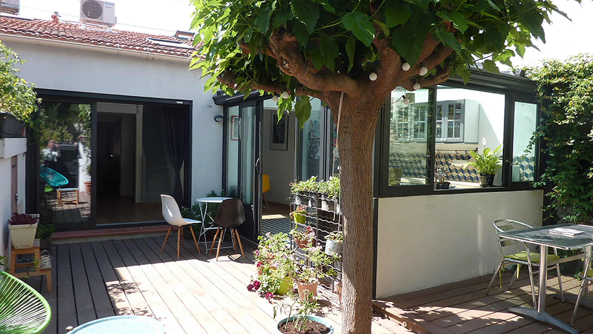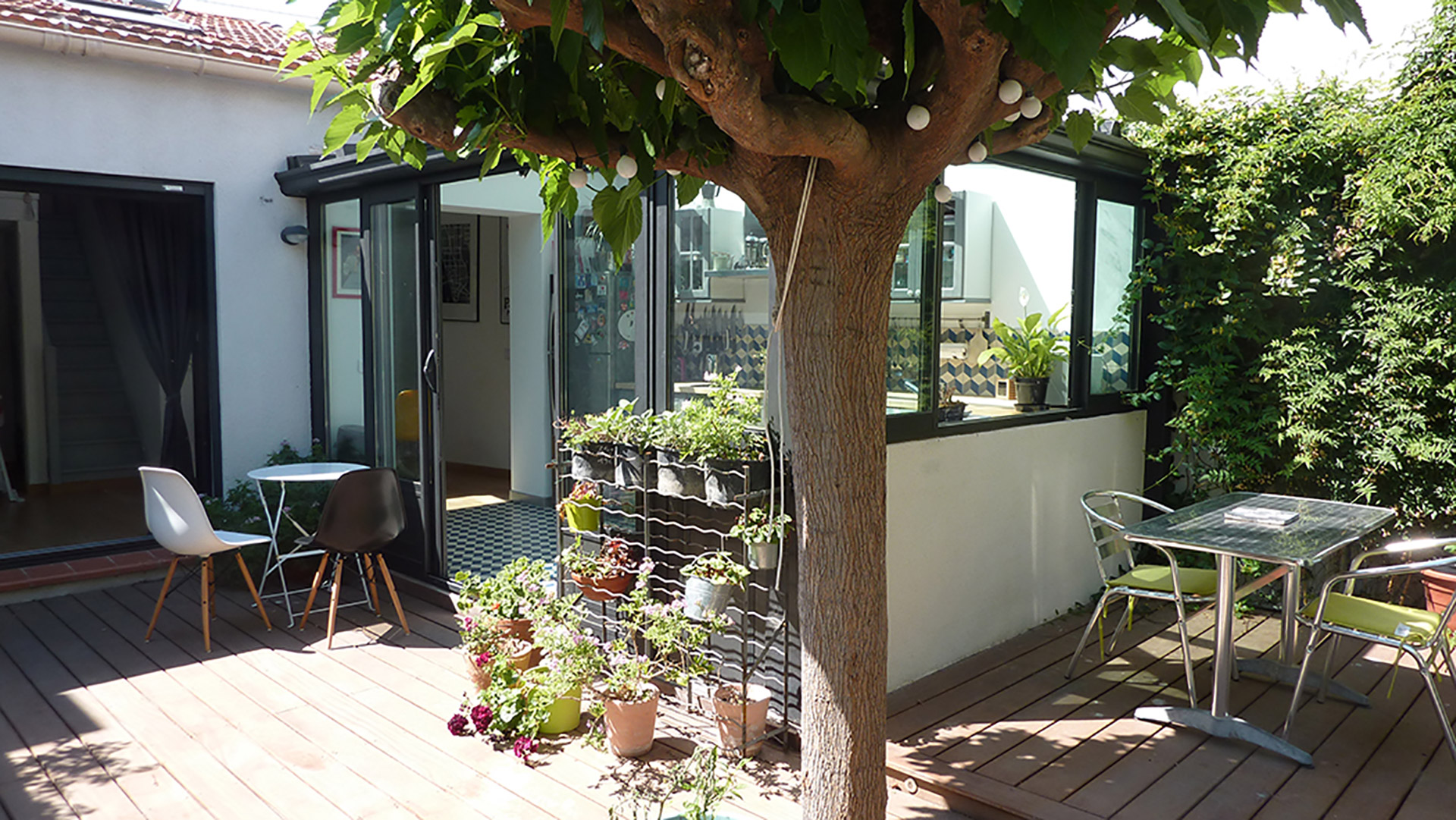 La maison s’articule autour d’un patio. La cuisine, située sous une verrière, fait le lien entre l’intérieur et l’extérieur.