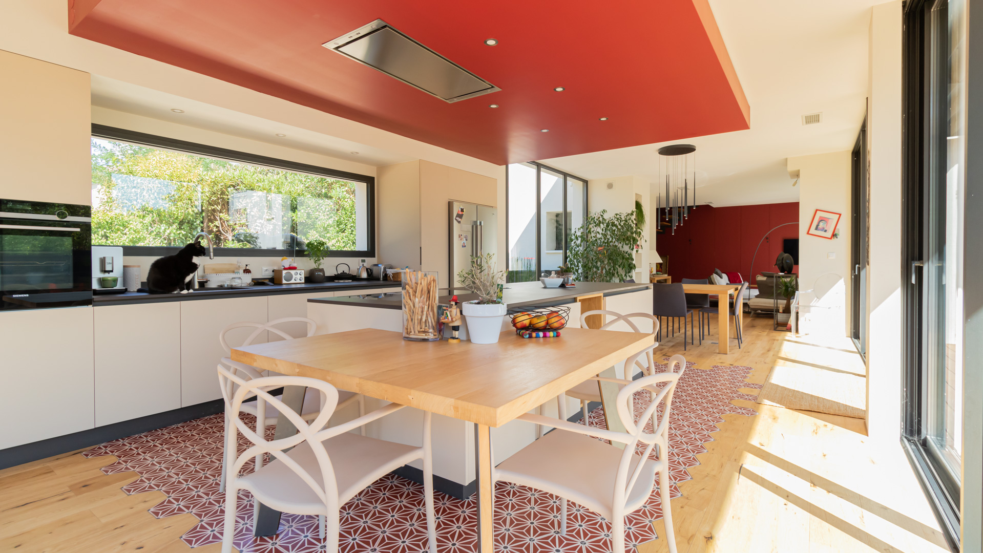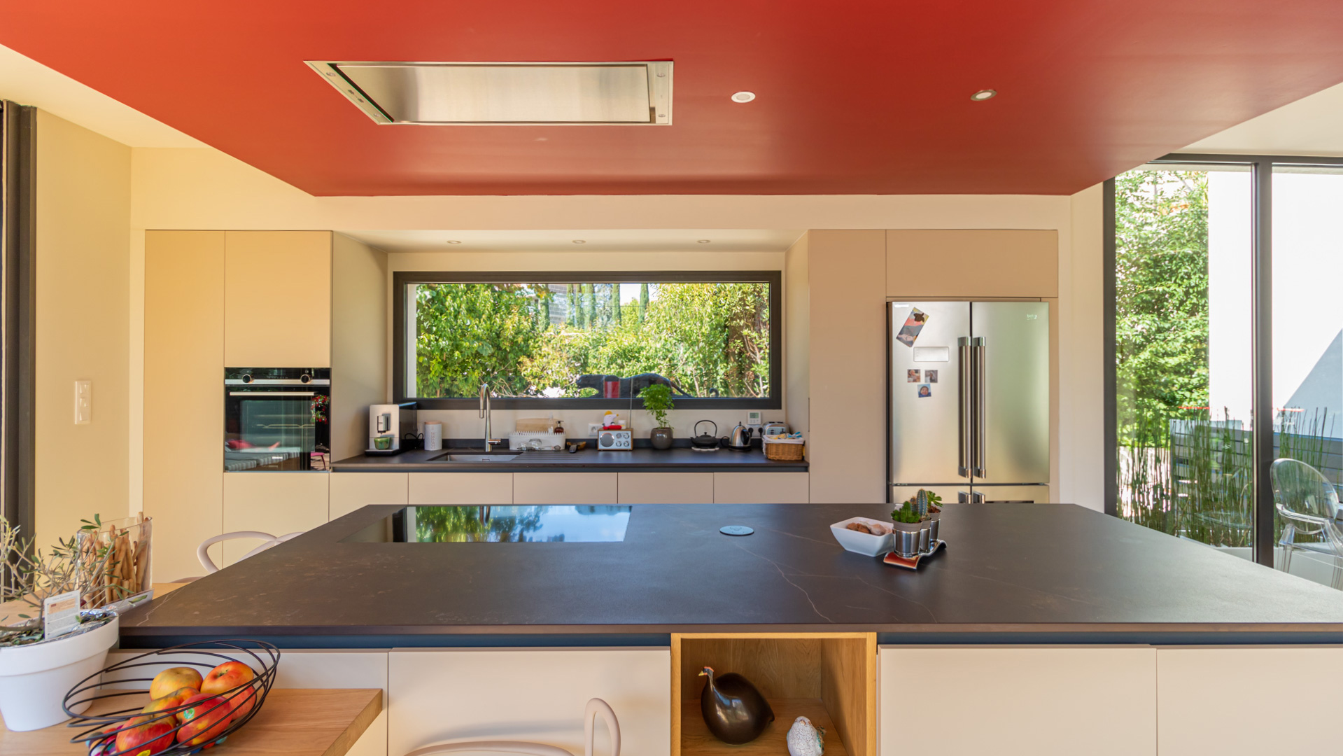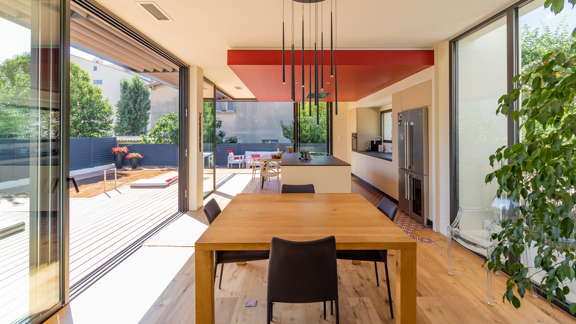 L’extension devient l’élément centrale de la maison. Elle est largement vitrée avec des baies qui peuvent s’ouvrir complètement afin de créer un espace dedans – dehors.