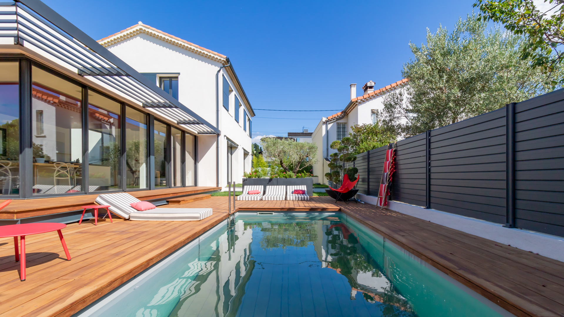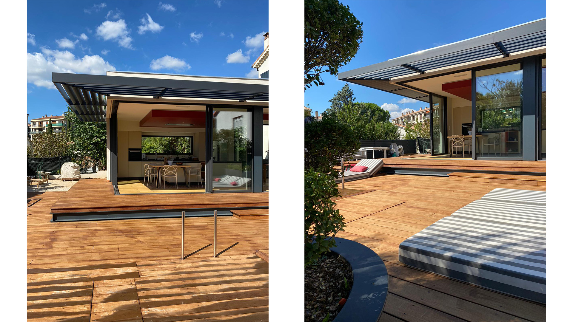 La petite piscine est dotée d’un fond amovible qui permet de créer une grande terrasse bois quand on le souhaite.