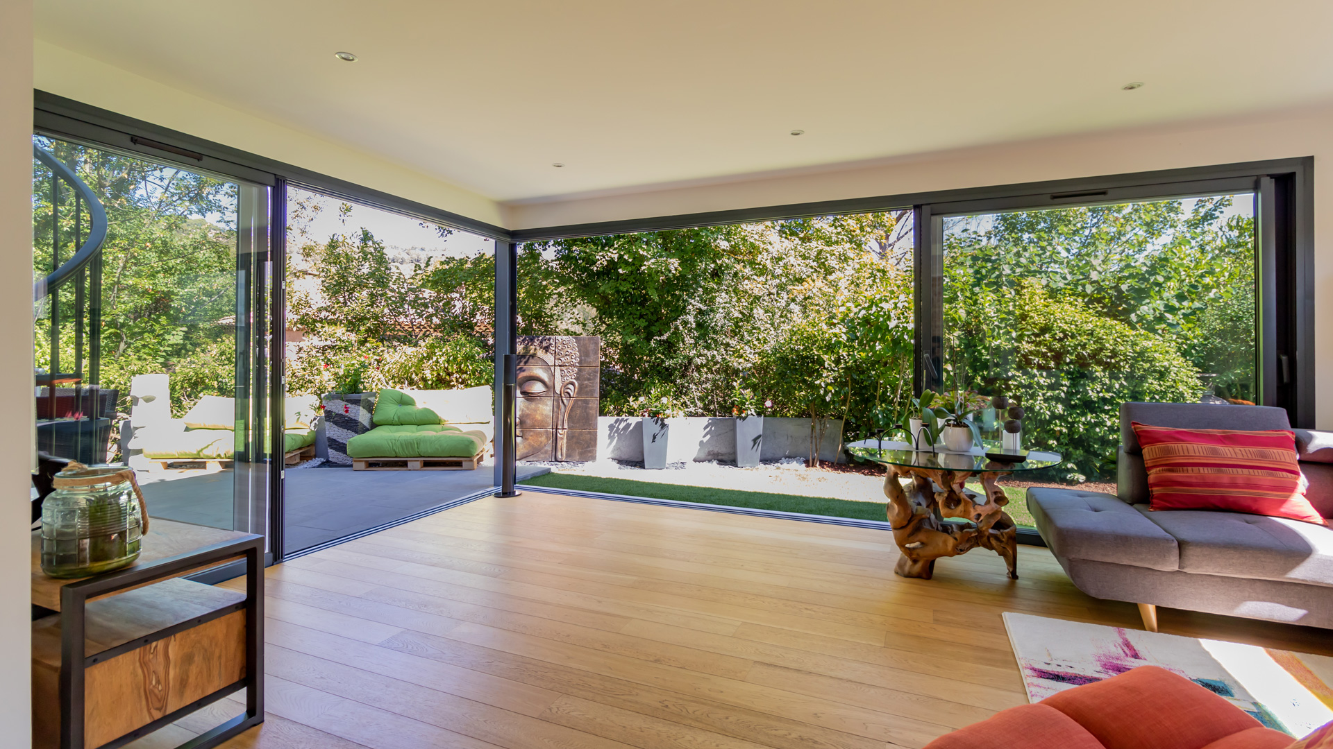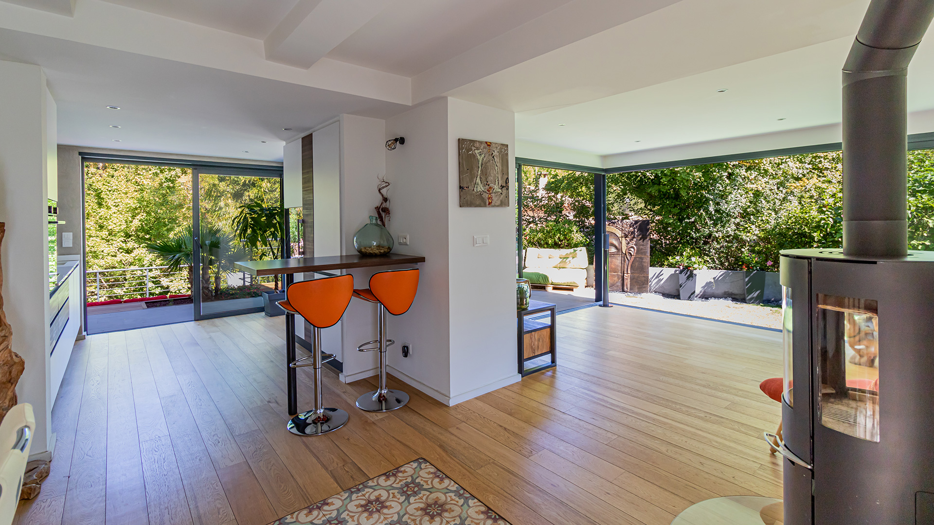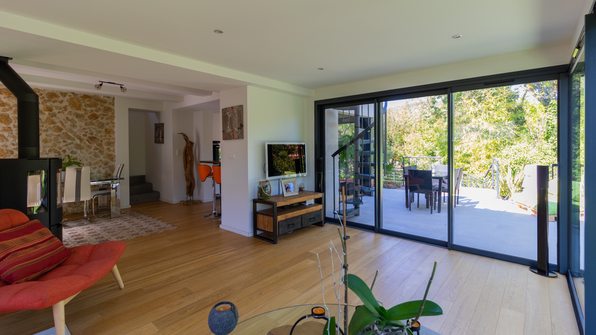 L’objectif du projet était de la consolider, de l’agrandir et créer des espaces largement ouvert sur l’extérieur permettant d’accentuer la perspective et d’agrandir visuellement l’espace.